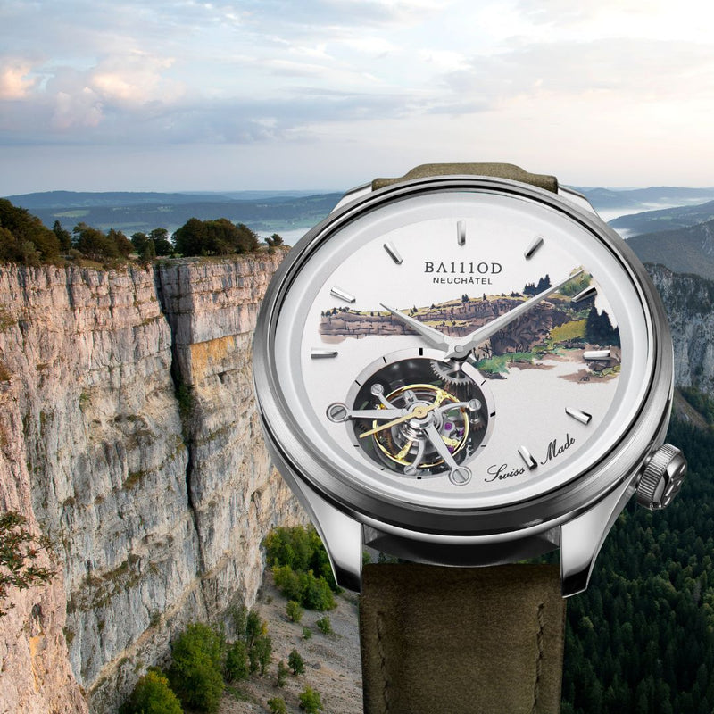 À l'occasion du 5e anniversaire de BA111OD, nous sommes fiers de dévoiler le Chapitre 4.12 "Neuchâtel" Tourbillon, le premier d'une série de trois garde-temps exclusifs. Cette pièce incarne la valeur fondamentale de l'authenticité, en rendant hommage à la ville de Neuchâtel, où le voyage de BA111OD a commencé. Dotée d'une miniature peinte à la main de la ligne d'horizon de Neuchâtel, cette montre tourbillon est un symbole de notre lien profond avec la région et de notre dévouement à l'artisanat.