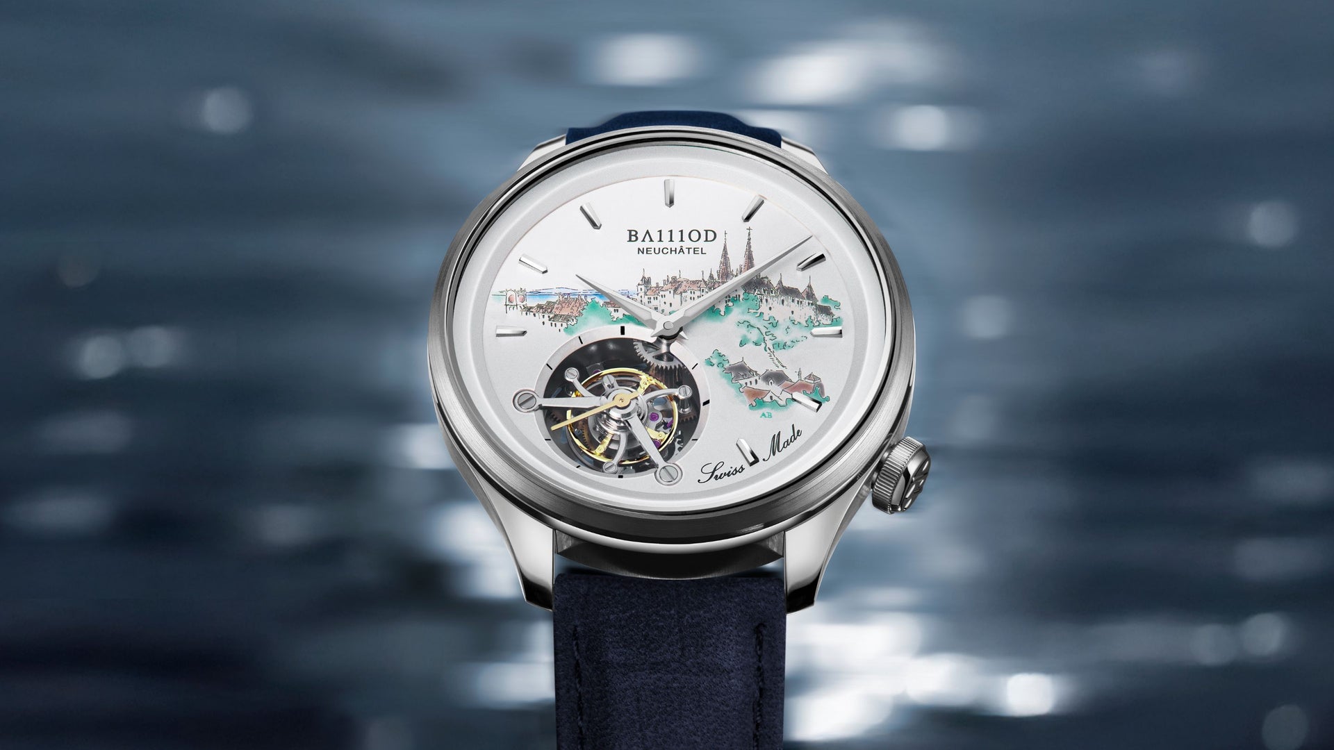 Au cœur du Chapitre 4.12 se trouve l'art de l'Atelier Blandenier, où la tradition et l'innovation se rencontrent. La peinture miniature méticuleuse de la ligne d'horizon de Neuchâtel, réalisée à l'acrylique, capture l'essence de la ville qui a donné naissance à BA111OD. Ce détail peint à la main, associé à la complication du tourbillon, transforme la montre en un garde-temps et une œuvre d'art.