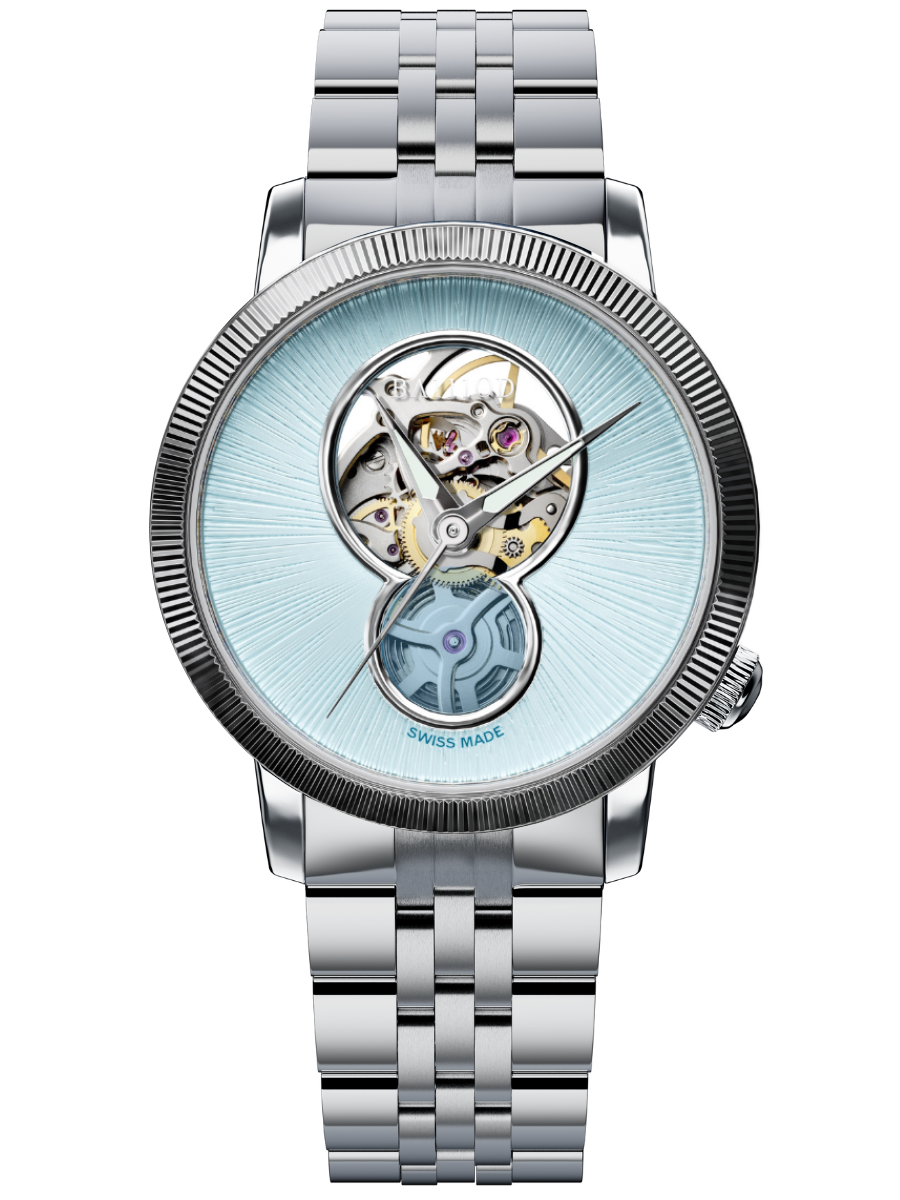 The signature feature - the crown positioned at 4 o'clock - remains intact. The semi-open textured sunray dial offers a sneak peek into its self-winding heart, bridging the realms of skeletonisation and transparency. Choose from enticing dial shades: champagne, ash grey, mint, sky blue, and ice white.